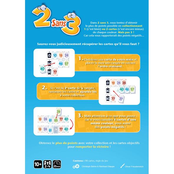 A leur tour les joueurs posent une carte dans l’une des rangées communes en respectant les règles de placement. Si la carte d’un joueur est la 5ème de sa rangée, il doit prendre une ou plusieurs cartes. Puis c’est au tour du joueur suivant etc.Prendre une carte d’une couleur c’est bien, en prendre deux c’est encore mieux … mais en prendre trois c’est la cata : les trois cartes sont converties en point négatifs ! Visez juste pour poser vos cartes au bon endroit au bon moment.2 sans 3 réussit le pari de réunir tout type de joueurs autour de la table : novices comme passionnés auront grand plaisir à se retrouver autour de ce jeu rapide, drôle et très malin.