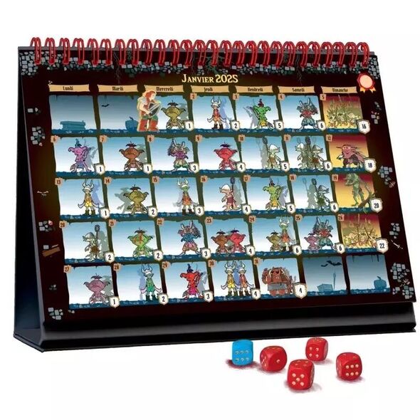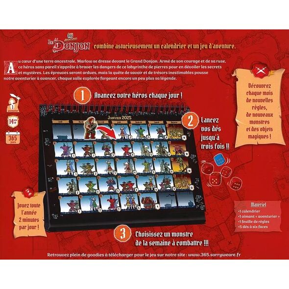 Le coffret inclut un calendrier, un magnet aventurier, un livret de règles et 5 dés. N’attendez plus pour plonger dans 365 Aventures – Le Donjon et marquez chaque jour de 2025 d’une aventure épique !