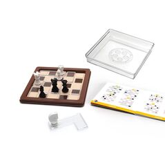 Les joueurs essaient de saisir les occasions pour réaliser des sauts en série. En même temps, on tente de gêner les efforts des autres joueurs. Ce jeu classique comporte 66 pions en bois et offre 24 variantes pour encore plus de plaisir.