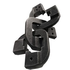 Les formes des deux pièces enchevêtrées sont parfaitement identiques et très simples. Elles ressemblent à des crochets utilisés pour suspendre des objets. Les pièces peuvent être séparées et réassemblées par une fascinante série magique de mouvements. Ce casse-tête Cast, simple et pourtant mystérieux, similaire à un casse-tête à désassembler, a été créé par le finlandais Vesa Timonen. Ce casse-tête fait partie du thème « Crochet ». Niveau de difficulté : 2/6