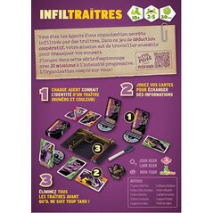 Vous êtes les agents d’une organisation secrète infiltrée par des traîtres. Votre mission, travailler ensemble pour démasquer vos ennemis avant qu’il ne soit trop tard ! Chaque agent connaît l’identité d’un traître. Pour éliminer les traîtres de chaque agent, jouez des cartes devant vous ou devant les autres pour échanger des informations. Déduisez ainsi collectivement l’identité secrète des traîtres désignée par un chiffre et une couleur. Pensez à économiser les ressources communes (pioche et munitions) sinon c’est la défaite ! Communication et logique seront vos armes pour relever tous les défis de ce jeu de déduction coopératif.