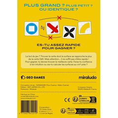 Plus grand, plus petit… ou presque identique ? Dans Miro Miro, votre œil est votre meilleur allié... à condition de ne pas vous laisser piéger par les apparences ! Dans le jeu   Miro Miro , les joueurs s’affrontent dans un défi de taille : comparer des surfaces à l'œil nu et trouver, le plus rapidement possible, celle qui se rapproche le plus de la carte Défi révélée au centre de la table. Toutes les cartes représentent des formes colorées posées sur une grille, mais attention : les apparences sont parfois trompeuses. Une forme qui semble plus grande peut en réalité occuper une surface inférieure à une autre. À chaque manche,...