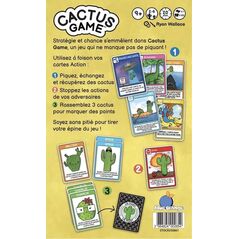 Qui s'y frotte, s'y pique ! Cactus Game  est un jeu de cartes passionnant, familial et rempli de cactus ! Votre objectif est d'assortir et de collectionner des séries de cactus pour gagner des points. Utilisez diverses cartes d'action pour prendre l'avantage sur vos amis.  Par exemple, lancez une carte regarder et piquer qui vous permet de regarder la main d'un autre joueur et de voler la carte de votre choix. Protégez-vous en jouant une carte « STOP » qui force toute action à s'arrêter net.