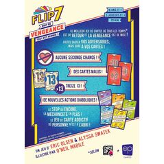 Flip 7 est de retour – Plus redoutable que jamais ! Retrouvez tout le plaisir du jeu original, agrémenté de nouvelles interactions entre joueurs et de cartes spéciales riches en coups fourrés !   Dans ce jeu de « stop ou encore », soyez le premier à atteindre 200 points pour l'emporter. Vous marquez des points en fonction de la valeur totale des cartes posées devant vous, mais attention : désormais, vos cartes ne sont plus jamais à l'abri !   Plus la valeur d'une carte est élevée, plus elle est présente en nombre dans la pioche. Si vous réussissez à aligner 7 cartes Chiffre différentes devant vous, vous mettez...