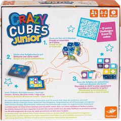 Crazy Cubes Junior est un jeu de casse-tête génial et rapide pour les enfants intelligents ! Le but du jeu est de reproduire le plus rapidement possible le modèle prédéfini de la carte d'exercice avec ses quatre blocs. Dès qu'une carte est retournée, tous les joueurs jouent simultanément les uns contre les autres. Celui qui reproduit correctement le modèle le plus rapidement gagne la carte. Le premier à avoir rassemblé quatre cartes gagne la partie. 48 défis successifs avec des aides qui permettent de commencer facilement. Inclut un mode passionnant pour les joueurs en solo.