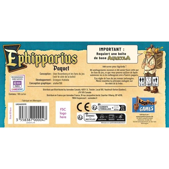 Ephipparius est un paquet d’extension pour le jeu de gestion multi primé Agricola. Donnez encore plus de richesses à vos parties avec ces incroyables créations. Il contient plus de 150 nouvelles cartes Aménagements Mineurs et Savoir-faire, crées par les fans du jeu eux-mêmes.