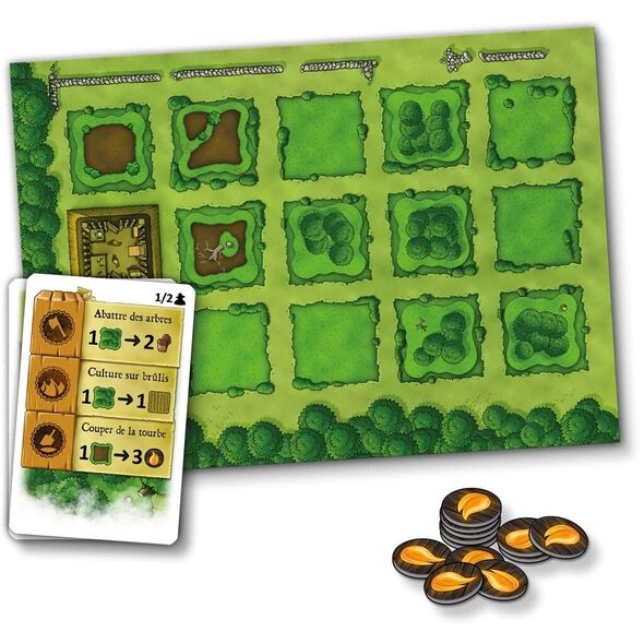 Coupez la tourbe à l’aide de cartes Action spéciales pour chauffer vos maisons et disposer de plus d’espaces de champs et de pâturages. Abattez également des arbres pour dégager des parcelles et récupérer du bois. Vous pourrez aussi élever des chevaux. Attention, en plus de nourrir vos paysans, vous devez aussi chauffer leurs logis, au risque de les voir tomber malades !