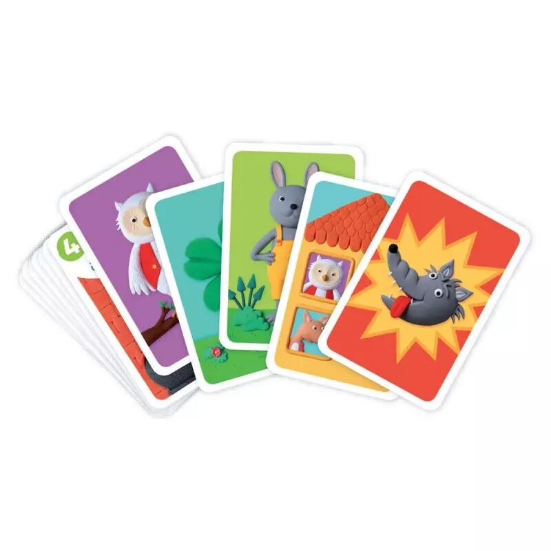 Dans le jeu de carte Au Loup!, de Nathan, on place les cartes "le loup arrive " en ligne, chaque joueur reçoit une carte maison et on place toutes les autres cartes faces cachées sur la table. Chaque joueur à son tour retourne autant de cartes qu'il le souhaite. Mais il doit s'arrêter et ne gagne rien s'il retourne une carte qu'il a déjà dévoilée ou s'il retourne une carte loup. Dans ce dernier cas il retourne une carte "le loup arrive", sauf s'il a retourné une carte trèfle.