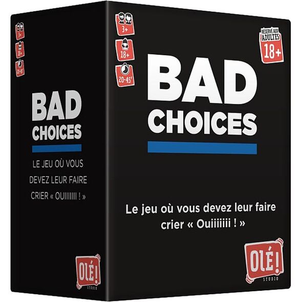 Qu'il s'agisse de décider si vous préférez gagner 50 000 $ plutôt que de laisser votre meilleur ami gagner 500 000 $, ou de répondre à des questions encore plus provocantes, Bad Choices est sûr de faire bouger les choses et de vous offrir des moments mémorables. Le joueur qui se débarrasse le premier de toutes ses cartes gagne.