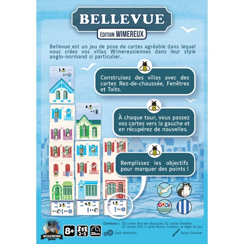 Bellevue est un jeu de pose de cartes agréable dans lequel vous créez votre rue en construisant des maisons d’architecture Wimereusiennes. Choisissez la meilleure carte de votre main à poser avant de les passer à vos adversaires. Vous devrez réaliser les objectifs de voscabanes de plage et de vos Toits, tout en gardant un œil sur les couleurs afin de marquer le plus de points et de remporter la victoire !