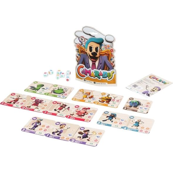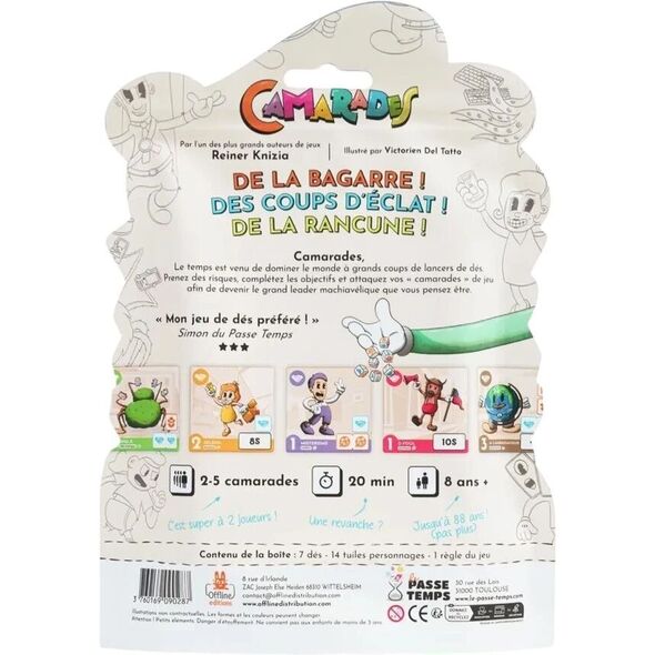 Par rapport aux autres jeux de dés, Camarades se distingue par son aspect vachard et jouissif. Il combine l’intensité du Risk avec une dimension euphorisante du Yam’s ou de Pickomino. Ce jeu est parfait pour celles et ceux à la recherche d’un jeu plein de coups d’éclat à jouer entre amis à l’apéro ou en famille, entre enfants ou entre adultes, que vous soyez aussi bien 2 que 5 camarades de jeux autour de la table (basse).
