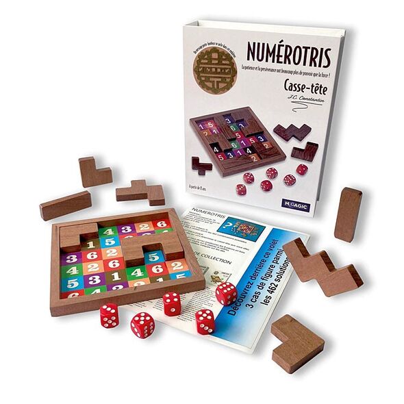 Cet extraordinaire plateau composé de chiffres regroupe 462 casse-têtes différents pour amuser toute la famille. De la combinaison la plus simple à la plus compliquée, chacun trouvera ses limites. Les 6 dés indiqueront les 6 chiffres à ne pas recouvrir. Chaque casse-tête sera différent du précédent. En combien de temps la nouvelle solution sera trouvée ? Des challenges peuvent être organisés entre amis pour des soirées réussies.