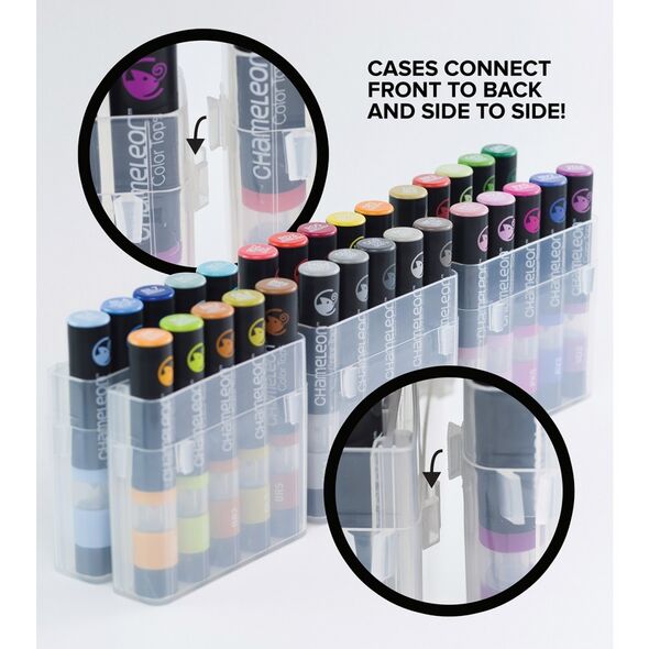 Il suffit de disposer simplement un Color Top Chameleon sur l'une des mines de votre marqueur Chameleon. Plutôt que de mélanger 2 couleurs sur votre feuille et d'user les mines de votre marqueur, mélangez-les à la source (mine) pour créer des teintes inédites et lumineuses, sans rupture de tons. Même 2 couleurs opposées comme le vert et le orange se mélangent très bien pour un rendu couleurs exceptionnel.