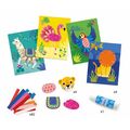 Ce coffret comprend 4 tableaux illustrés (21 x 28 cm), 82 bandes de papier, 4 formes en carton, un baton de colle et un livret avec des idées créatives.