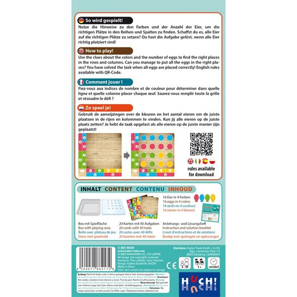 Les œufs doivent être placés dans les bons espaces selon les règles de ponte. Les informations devant les rangées et sous les colonnes donnent des indices sur le nombre d'œufs, de quelle couleur et dans quelle zone du plateau de jeu ils doivent être placés. Mais le Les tâches deviennent de plus en plus difficiles!