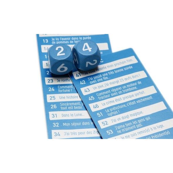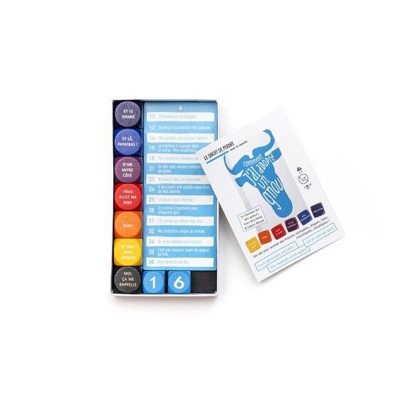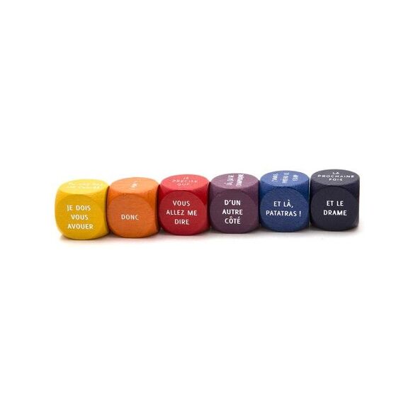 Au coeur du jeu : 6 dés colorés avec des mots de transition sur chacune des faces, tels que Je dois vous avouer / Mais / Tout à coup / D’un autre côté / J’avais prévu le coup / C’est comme ça que .