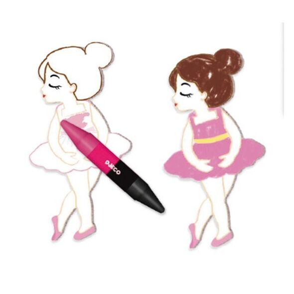 Ce coffret comprend 4 crayons de cire double côté, un tube de colle, 10 feuilles illustrées prédécoupées, 4 feuilles blanches et un livret avec des idées créatives.