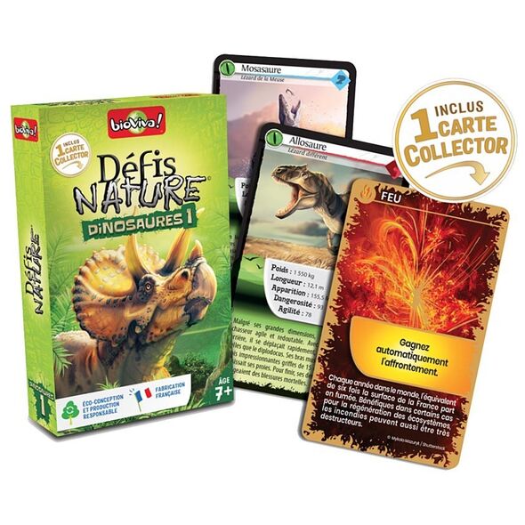 Défis Nature vous emmène à la rencontre des dinosaures. Au travers de cartes superbement illustrées, découvrez les particularités des espèces les plus répandues comme les plus menacées, puis pariez sur les points forts de vos dinosaures pour collecter toutes les cartes du jeu et remporter la partie. Alors, prêts à relever le défi ? De 2 à 6 joueurs. Dès 7 ans. Fabriqué en France.
