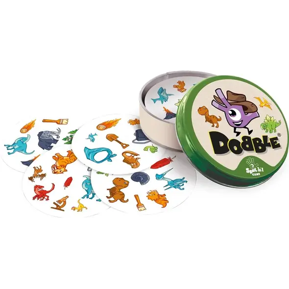 Pars à la découverte du monde des dinosaures avec Dobble Dinosaures! Retrouve plus vite que tes adversaires le symbole identique entre deux cartes dans ce jeu d'observation et de réflexes familial. Une version préhistorique de Dobble pour des parties toujours plus amusantes!