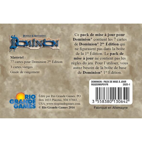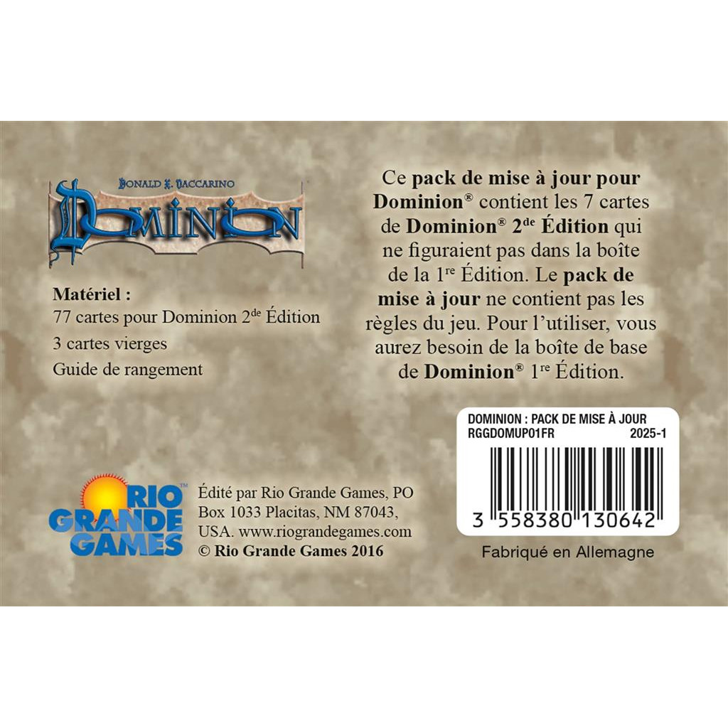 La seconde édition de Dominion contient des cartes qui ne figuraient pas dans la 1ère. Ce Pack de mise à jour a été conçu pour ceux qui veulent mettre à jour leur boîte, sans avoir à acquérir l’intégralité de la nouvelle édition. Il propose les 7 cartes inédites : Artisane, Brigand, Messagère, Marchande, Braconnière, Garde, et Vassal. Chacune d’elles est en plusieurs exemplaires, prêts à être intégrés à votre première édition.