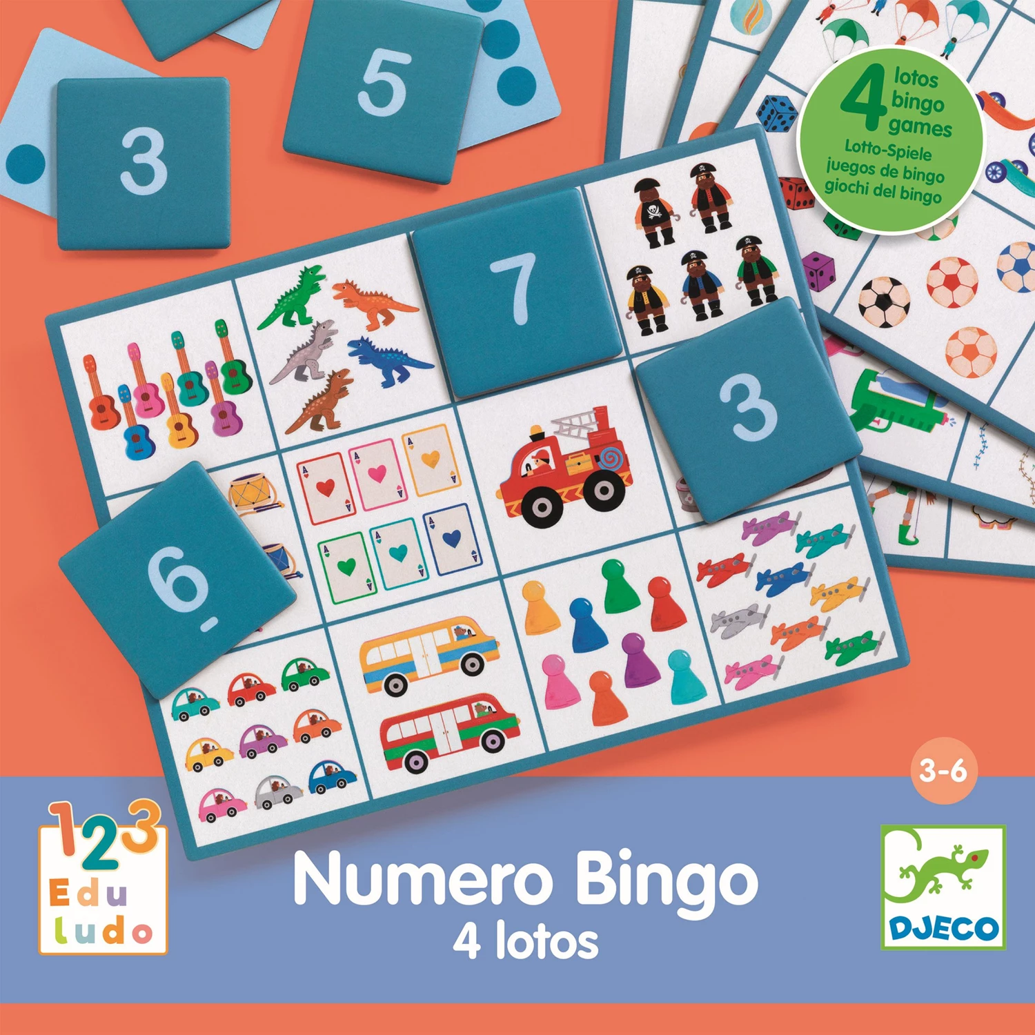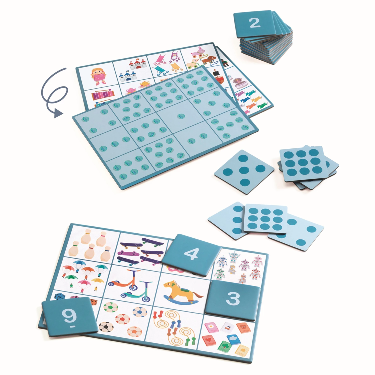 4 jeux de loto pour compter. Une jeu connu de tous pour apprendre à compter, à dénombrer, à connaître la correspondance entre quantités et chiffres - autour du thème des jouets. Une difficulté croissante et des solutions faciles à vérifier.