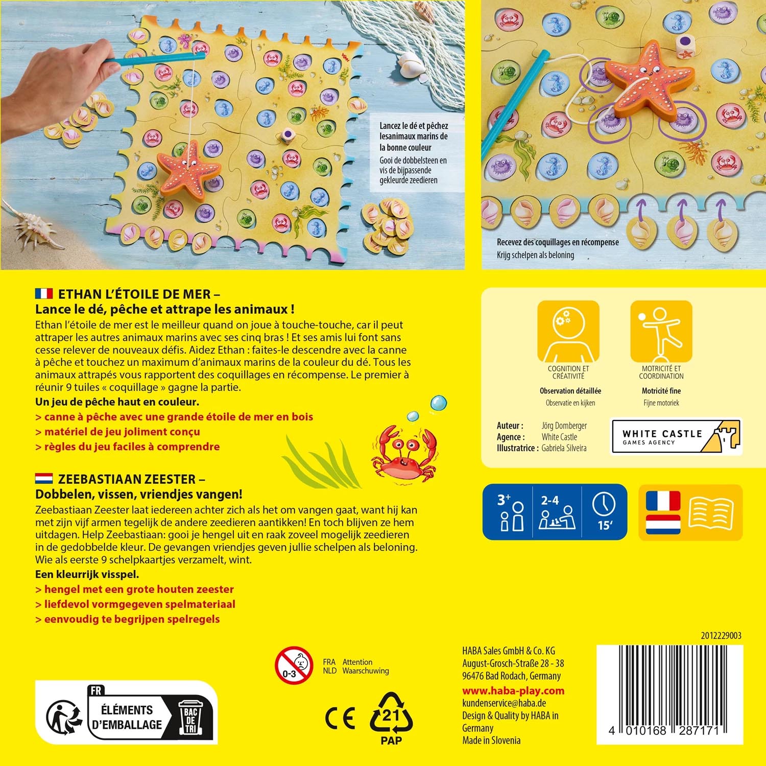Ethan l’étoile de mer est le meilleur quand on joue à touche-touche, car il peut attraper les autres animaux marins avec ses cinq bras ! Et ses amis lui font sans cesse relever de nouveaux défis. Les enfants font descendre Ethan l’étoile de mer et tentent de toucher un maximum d’animaux marins de la couleur du dé pour obtenir des coquillages en récompense pour chaque ami pêché. Le premier à réunir 9 tuiles « coquillage » gagne la partie.