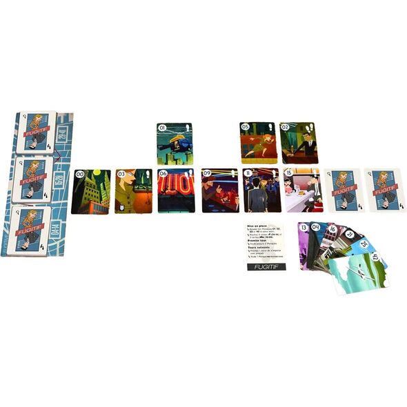 Le paquet principal est composé de Planques représentant les endroits où se cache le Fugitif. Les cartes SHIFT permettent d’ajuster l’équilibre entre les deux rôles lors de plusieurs parties consécutives.