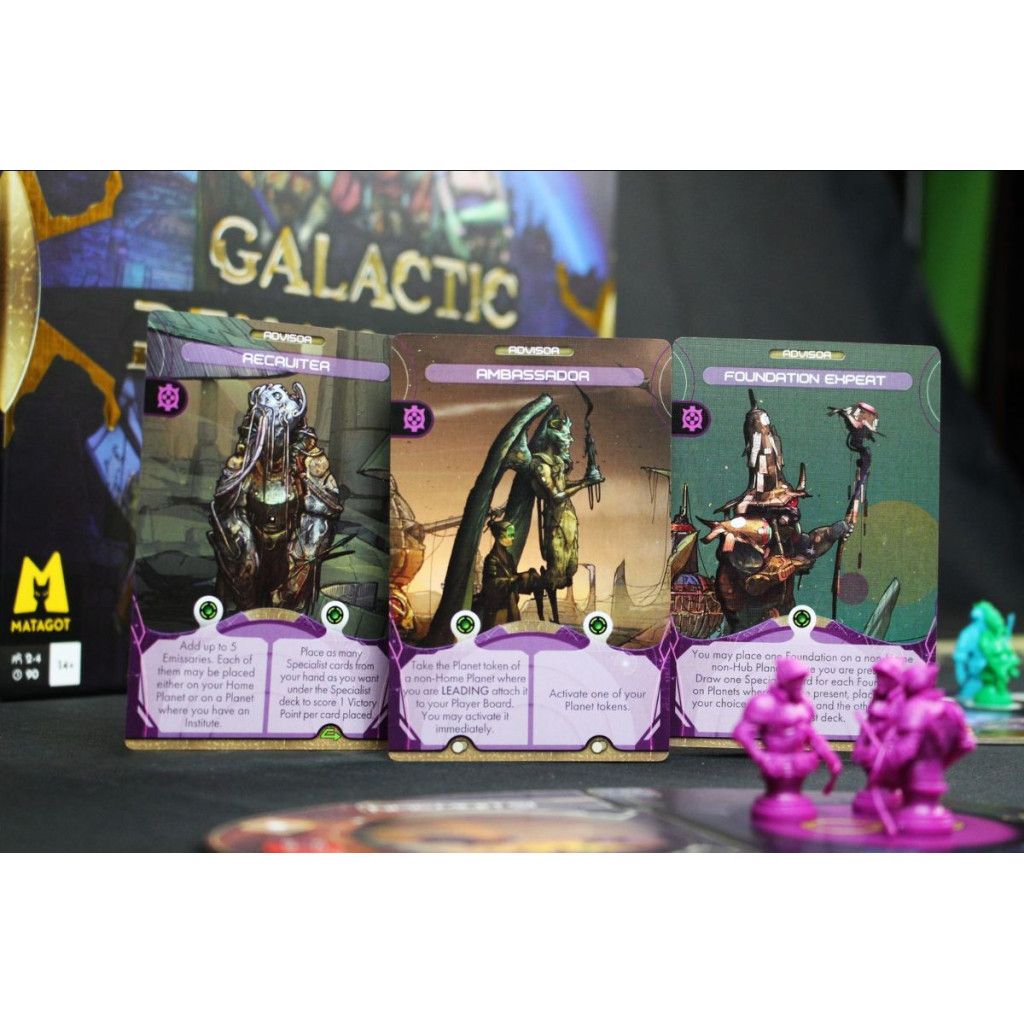 Dans Galactic Renaissance, vous constituez votre équipe en ajoutant de nouveaux spécialistes, chacun unique, à votre deck de cartes de base. Avec cette équipe, vous découvrez de nouvelles planètes et systèmes, vous reconnectez avec des civilisations perdues, étendez votre influence, construisez des ambassades et semez le désordre dans les factions adverses - tout cela dans le but de marquer des points de victoire plus rapidement que vos adversaires.