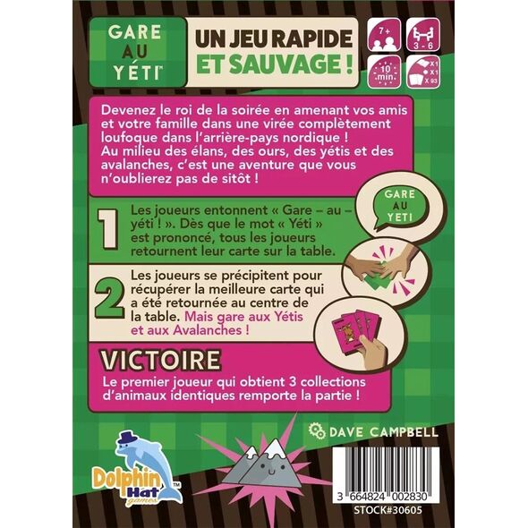 Chaque joueur prend une carte dans la pile. Tout le monde scande " Gare au Yéti! " tout en retournant sa carte, puis se précipite pour choisir la meilleure carte afin de former une paire. Le premier joueur à rassembler trois séries d'animaux identiques remporte la partie !
