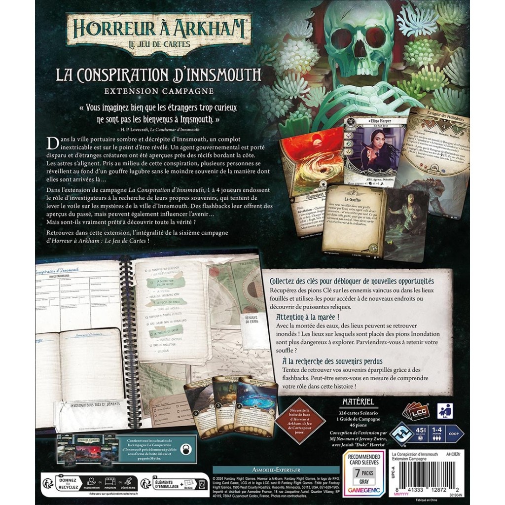 Cette extension contient les deux premiers scénarios de la campagne La Conspiration d’Innsmouth ainsi que de nouveaux investigateurs et de nouvelles cartes Joueur pour personnaliser davantage le jeu. Horreur à Arkham : le Jeu de Cartes est un jeu de cartes coopératif dans lequel les joueurs incarnent des investigateurs qui tentent d’élucider de terrifiants mystères surnaturels.