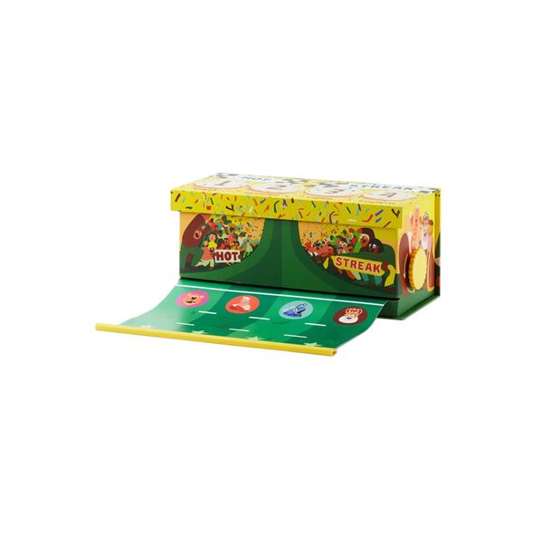 Mélangez le paquet, brûlez trois cartes, puis révélez les cartes une par une, en déplaçant les mascottes le long de la piste. Elles peuvent parfois dévier vers une autre voie et renverser un autre coureur, parfois faire demi-tour, parfois se déplacer toutes en même temps, et parfois simplement reculer !