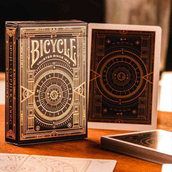 Le jeu de cartes Bicycle® Cypher est inspiré des mystérieux symboles et cryptographies utilisés par des sociétés secrètes historiques. Les faces et le dos des cartes contiennent un message crypté que les collectionneurs peuvent déchi!rer. Une clé de déchi!rage figure sur les cartes supplémentaires à l’intérieur du paquet. Ce jeu de cartes somptueux vient dans un paquet bleu marine sophistiqué, à l’intérieur duquel est imprimé un motif élégant représentant une clé. Les lignes riches en détails à l’extérieur du paquet sont dorées à chaud et mises en valeur par un gaufrage.