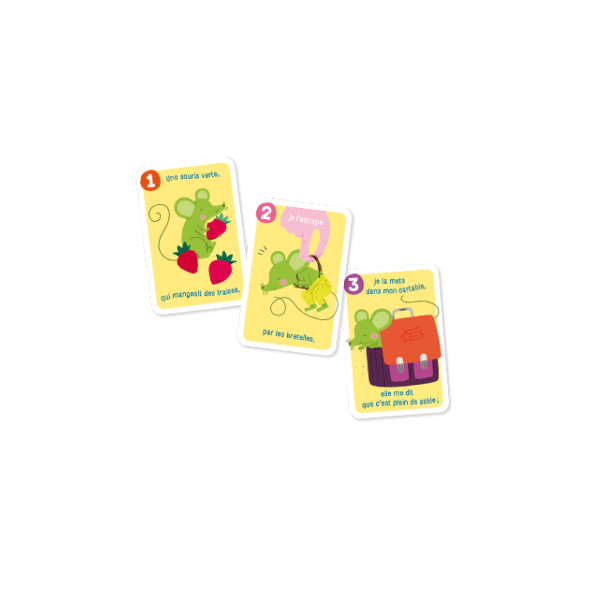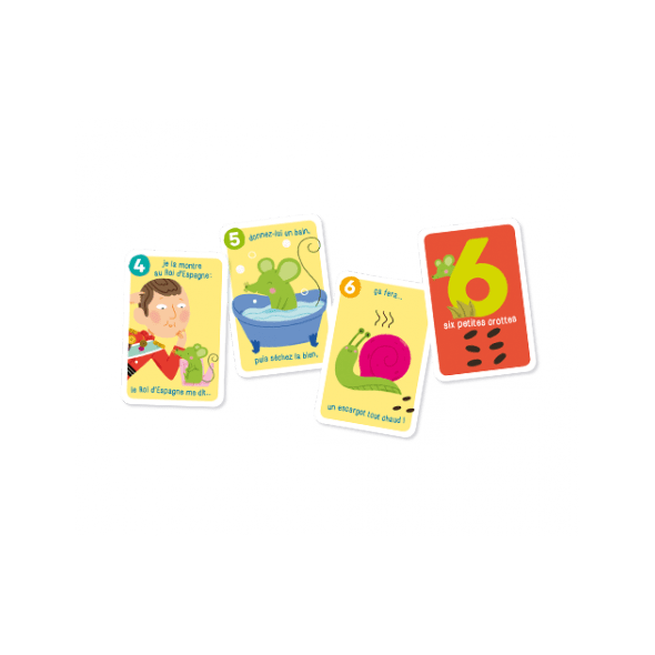 Un jeu de séquences où il faut jouer des séries de 6 cartes dans le bon ordre et raconter des histoires farfelues : une souris verte qui mangeait des fraises… je l’attrape par la moustache… Des cartes bonus font gagner des « crottes » et celui qui en a le plus a gagné !