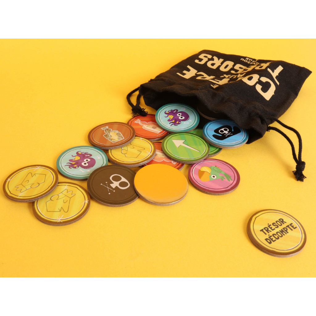 Tu viens de trouver un super coffre rempli de trésors ! Collectionne un maximum de pièces pour gagner la partie, mais attention aux autres pirates qui désirent le même butin que toi ! Un jeu de chance et de tactique !