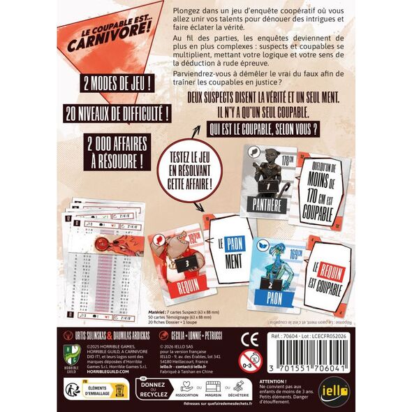 Le Coupable est ... Carnivore! promet que le coupable est carnivore, mais vous devrez déterminer vous-même qui est le coupable. Peut-être qu'un herbivore est en réalité responsable du crime, ou peut-être que vous recherchez deux coupables, voire trois ?