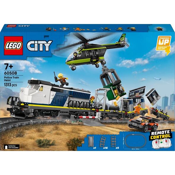 Ce train électrique Powered Up pour enfants inclut une locomotive fonctionnelle et 3 wagons plateforme transportant une cellule, un coffre-fort et une voiture de rallye. Le set inclut également un circuit ovale avec passage à niveau.