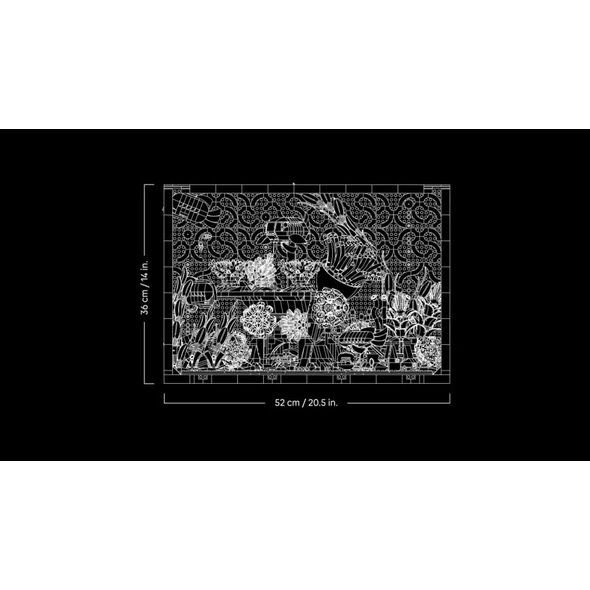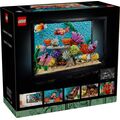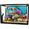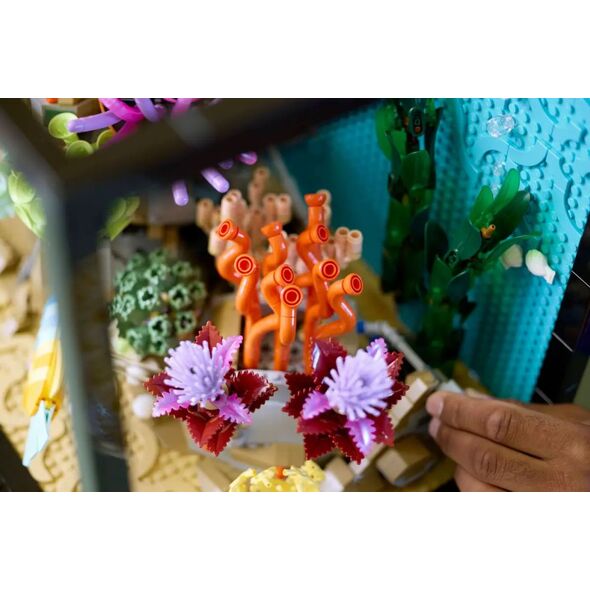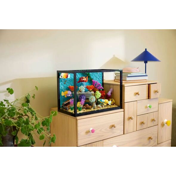 Cet aquarium décoratif intègre des fonctions amusantes. Faites tourner les boutons et manivelles pour faire nager un poisson, balancer du corail, faire sortir un crabe d’une grotte sous-marine ou ouvrir un coffre au trésor. L’aquarium inclut 4 poissons, des plantes, du corail, des vers marins et une coquille d’huître avec une perle, ainsi que des bigorneaux LEGO et des bulles d’air.