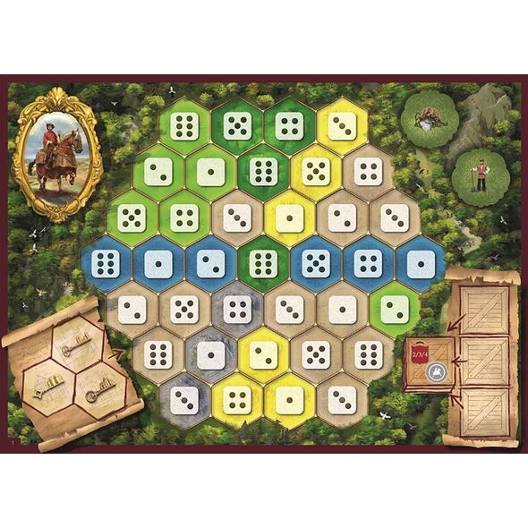 Contenu : 164 tuiles hexagonales, 42 tuiles Marchandises, 24 Pièces de monnaie, 26 tuiles Ouvrier, 12 tuiles Bonus, 4 tuiles PV, 8 pions, 9 dés, 1 plateau de jeu, 16 plateaux individuels, 4 aides de jeu, 4 nouvelles tuiles hexagonales, 6 plateaux Postes frontière, 9 tuiles Château blanc, 5 tuiles Auberge, 12 cartes Routes commerciales, 18 tuiles Bouclier, 2x4 plateaux individuels pour jouer en équipes, 2 plateaux individuels pour jouer en solo et 1 livret de règles.