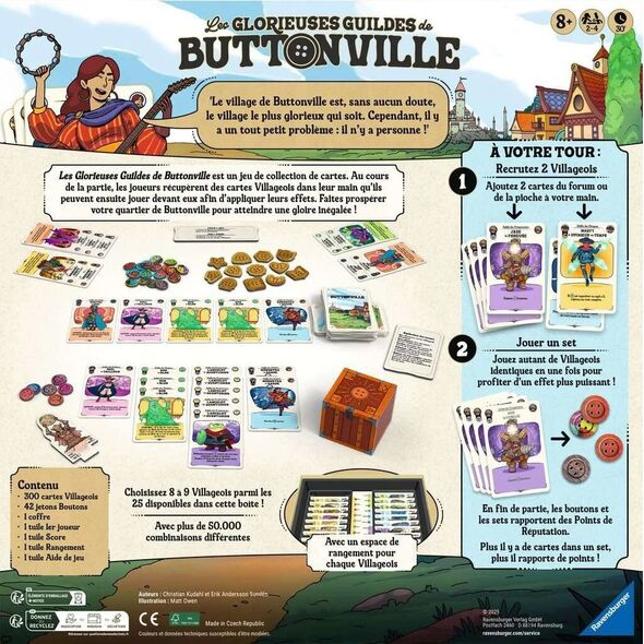 Le village de Buttonville est, sans aucun doute, le village le plus glorieux qui soit. Cependant, il y a un tout petit problème : il n’y a personne ! Partez à la rencontre des glorieuses guildes environnantes, recrutez de glorieux individus aux capacités incroyables et faites prospérer votre quartier de Buttonville pour atteindre une gloire inégalée !Les Glorieuses Guildes de Buttonville est un jeu de cartes pour 2 à 4 joueurs et à partir de 8 ans. Dans Les Glorieuses Guildes de Buttonville, vous recruter un maximum de Villageois, pour pouvoir jouer les plus grands sets de citoyens identiques et profiter au maximum de leurs capacités. À votre tour, recruter 2 Villageois du forum ou de la pioche, puis vous pouvez jouer plusieurs cartes du même Villageois qui constituent un set. La plupart des Villageois ont un effet lorsque vous jouez le set, parfois plus vous jouez de Villageois identiques dans le set, plus l'effet sera puissant. En fin de partie, chaque set de Villageois vous rapporte des points de victoire en fonction du nombre de Villageois dans chacun de vos sets. Jouez astucieusement vos cartes pour espérer remporter la partie !