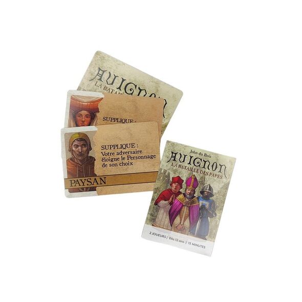 Avignon : A Clash of Popes est un jeu de cartes de manipulation d'influence rapide dans lequel les deux joueurs sont des candidats rivaux pour le pape au 14ème siècle. Les joueurs gagnent en influence en adressant une pétition aux membres de l'Église médiévale, tels que les cardinaux, les nobles et les chevaliers, et en utilisant les pouvoirs uniques des personnages pour tirer les cartes de personnage de leur côté de la table (leur congrégation), ou forcer un adversaire à pousser les cartes vers eux. Le premier joueur à avoir trois personnages dans sa congrégation gagne.