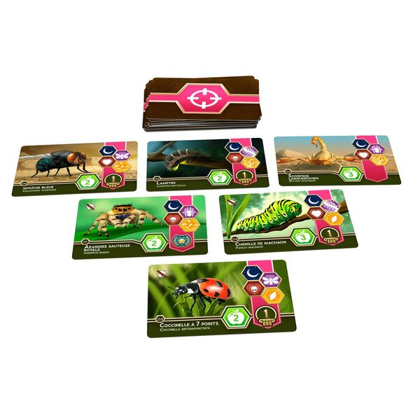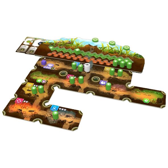 Le plateau est constitué d’une carte modulaire représentant le micro-monde des insectes : zones de chasse, emplacements stratégiques, bonus environnementaux et une termitière centrale convoitée. Chaque joueur commence avec sa propre fourmilière, point d’origine de son expansion.