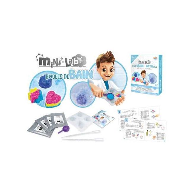 La boite contient 3 couleurs de bicarbonate de soude, de l'acide citrique, une cuillère mesure, un moule avec 4 formes, 2 pipettes et la notice illustrée en couleurs.