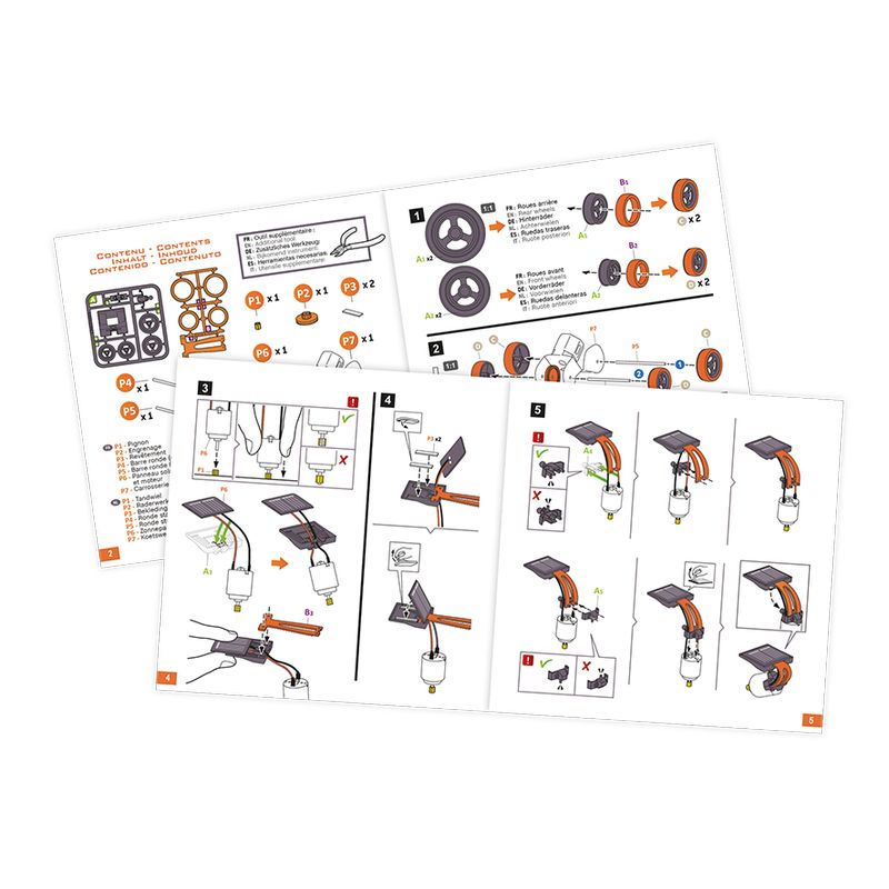 Assemble les pièces en métal de la voiture et fais-la avancer grâce à l'énergie du soleil. Inclus une notice illustrée en couleurs avec l'assemblage pas à pas et un quiz.