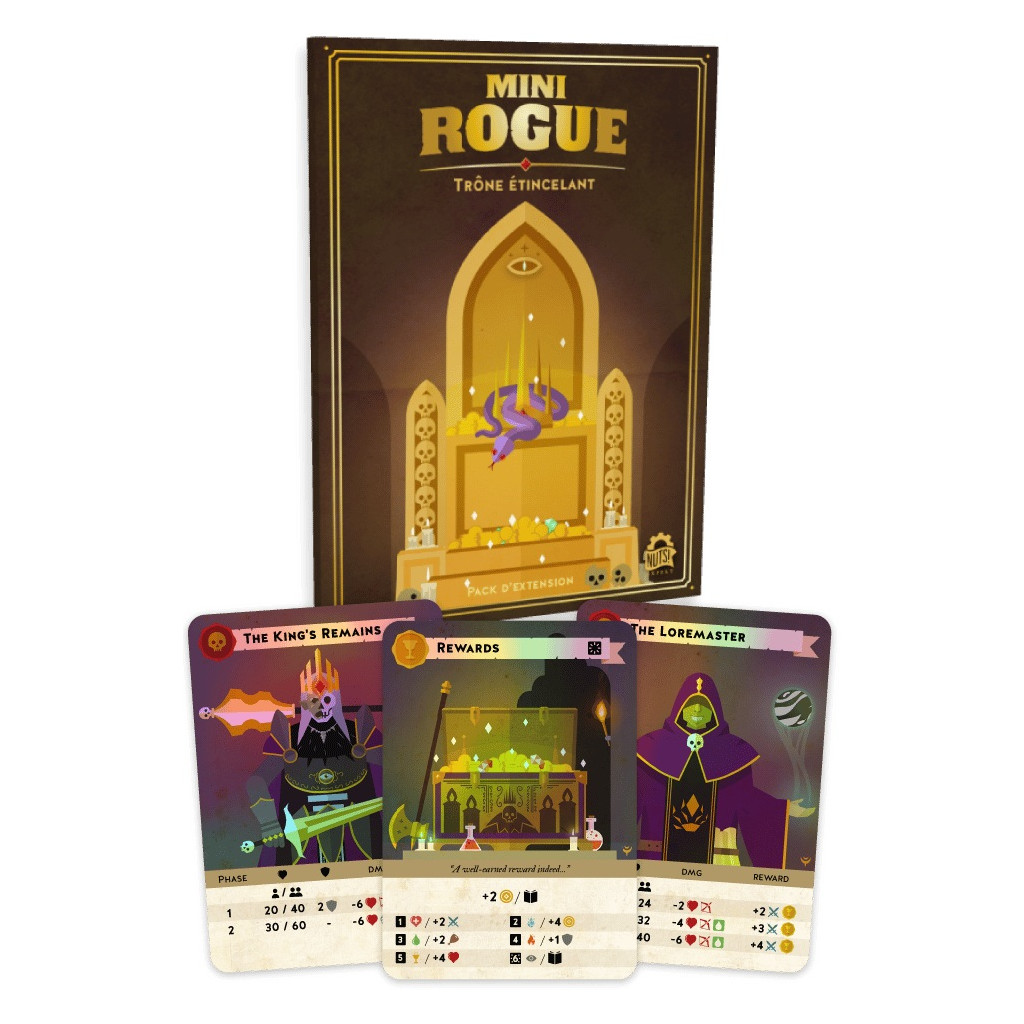 Trône Étincelant est une extension pour Mini Rogue, qui contient tous les Gardiens présents dans Le Conseil, le Gardien présent dans l’extension Montagne de la Tourmente, le Gardien présent dans l’extension Gardiens Oubliés ainsi que la carte Récompense/Criminel du Conseil.