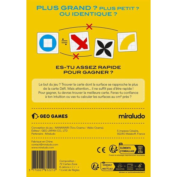 Dans le jeu Miro Miro, les joueurs s’affrontent dans un défi de taille : comparer des surfaces à l'œil nu et trouver, le plus rapidement possible, celle qui se rapproche le plus de la carte Défi révélée au centre de la table. Toutes les cartes représentent des formes colorées posées sur une grille, mais attention : les apparences sont parfois trompeuses. Une forme qui semble plus grande peut en réalité occuper une surface inférieure à une autre.