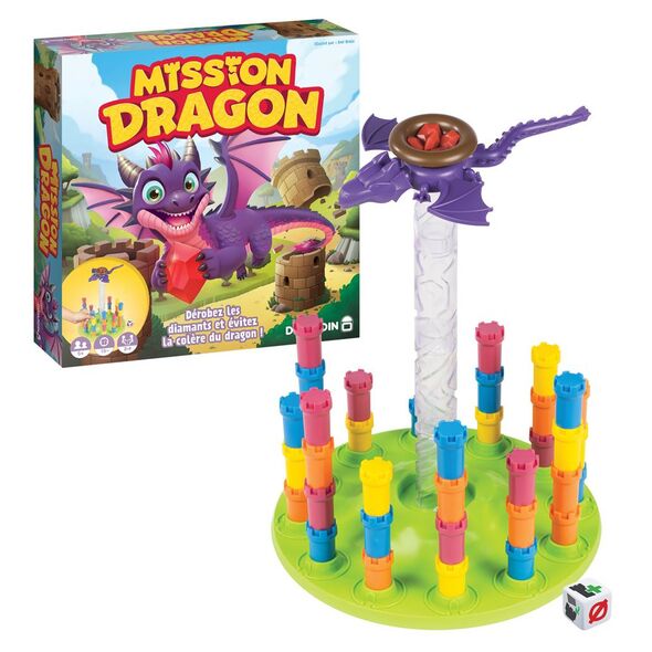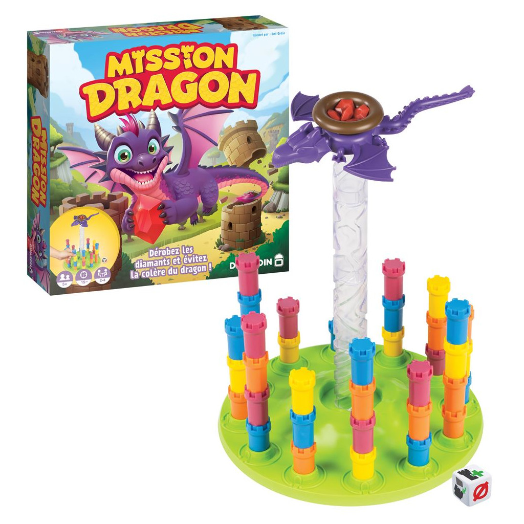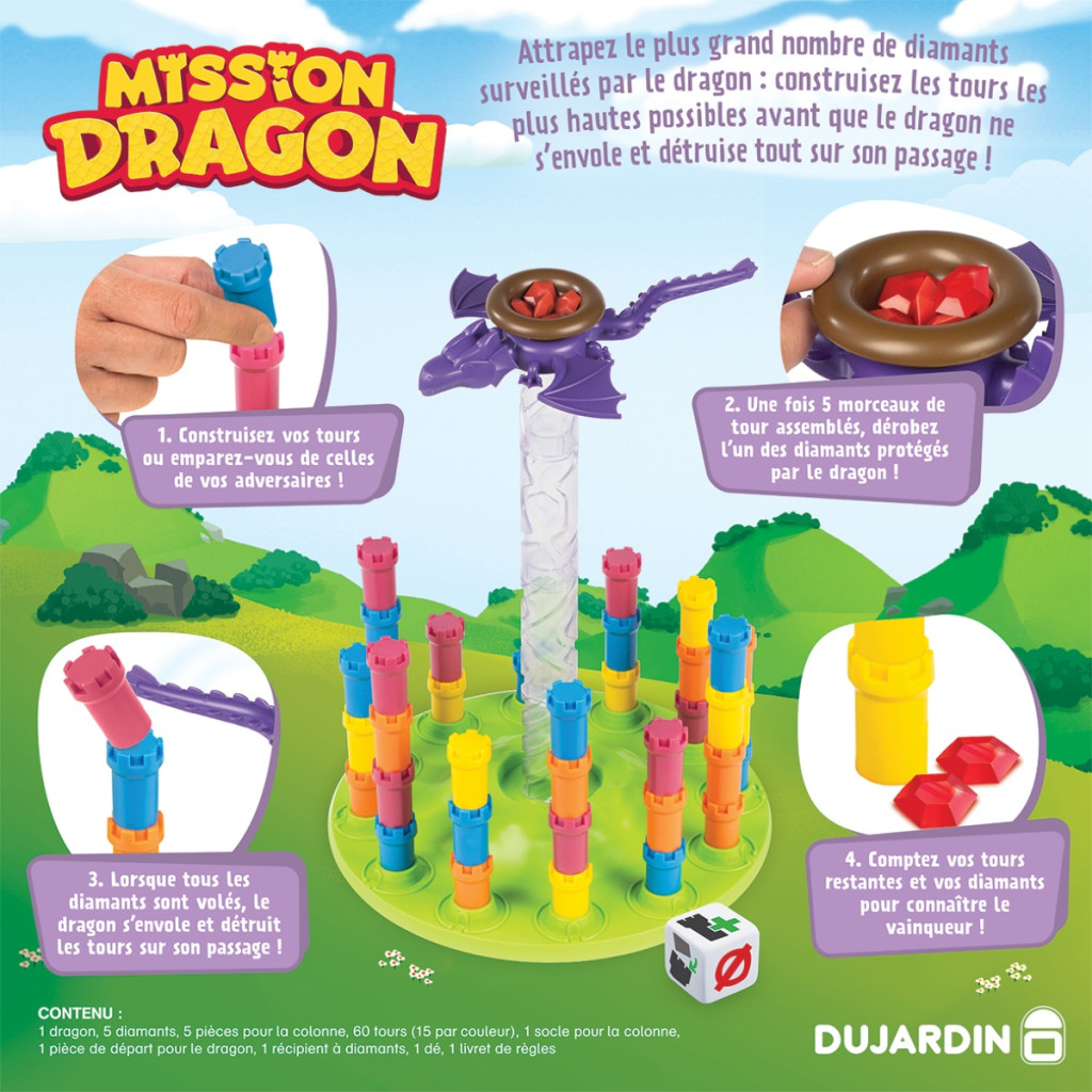 Construisez la plus haute tour possible en lançant les dés pour voler les rubis soigneusement gardés par le dragon dans Mission Dragon !