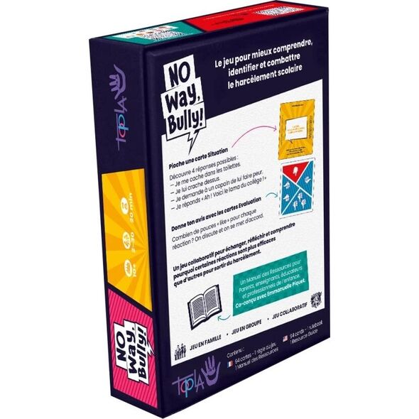 Dans ce jeu, les joueurs et joueuses sont invités à réfléchir ensemble, à discuter et à évaluer plusieurs réactions possibles face à des situations de harcèlement (physique, social, psychologique, cyberharcèlement...)