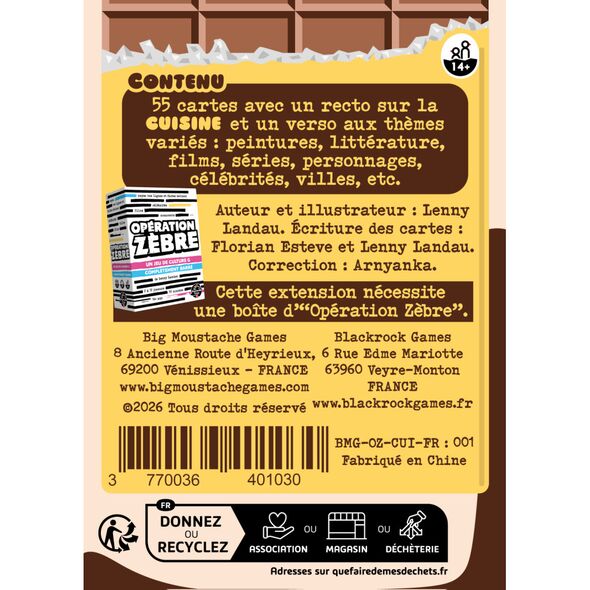 Opération Zèbre : Extension Cuisine est une extension de 55 cartes recto-verso (soit 110 nouvelles cartes à faire deviner) introduisant de nouveaux thèmes, dont la cuisine, à rajouter à votre jeu de base.