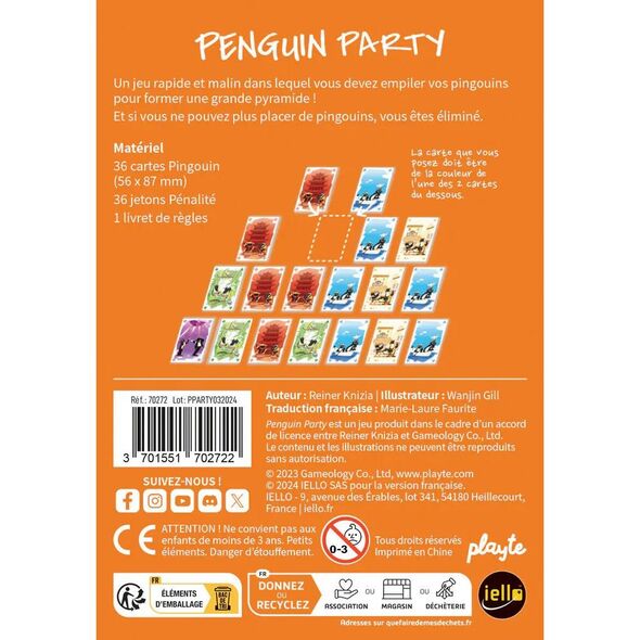 Les cartes sont distribuées aussi régulièrement que possible, la dernière carte d’une partie à cinq joueurs étant la première carte à la base de la pyramide. À chaque tour, vous pouvez soit jouer une carte à gauche ou à droite de la base de la pyramide, qui ne peut avoir plus de huit cartes de large, soit jouer une carte à un niveau supérieur de la pyramide, à condition qu’elle soit soutenue par deux pingouins, dont l’un au moins est de la même couleur que la carte jouée.