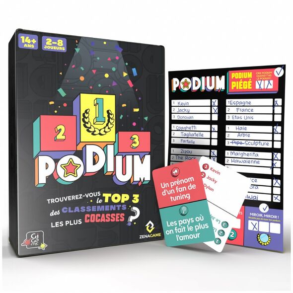 Attention : nul besoin d'être un expert. Dans Podium, le sérieux flirte avec l’absurde pour vous offrir des moments de rires inoubliables. À chaque carte, vous rencontrez deux types de classements : des classements insolites provenant d'études officielles et des classements plus cocasses confectionnés avec les réponses de 100 personnes à un sondage. Pour faire simple, vous pouvez vous retrouver à essayer de deviner le TOP3 des « pays avec le plus de roux » et, juste après, le TOP3 « des objets qui se sucent ».